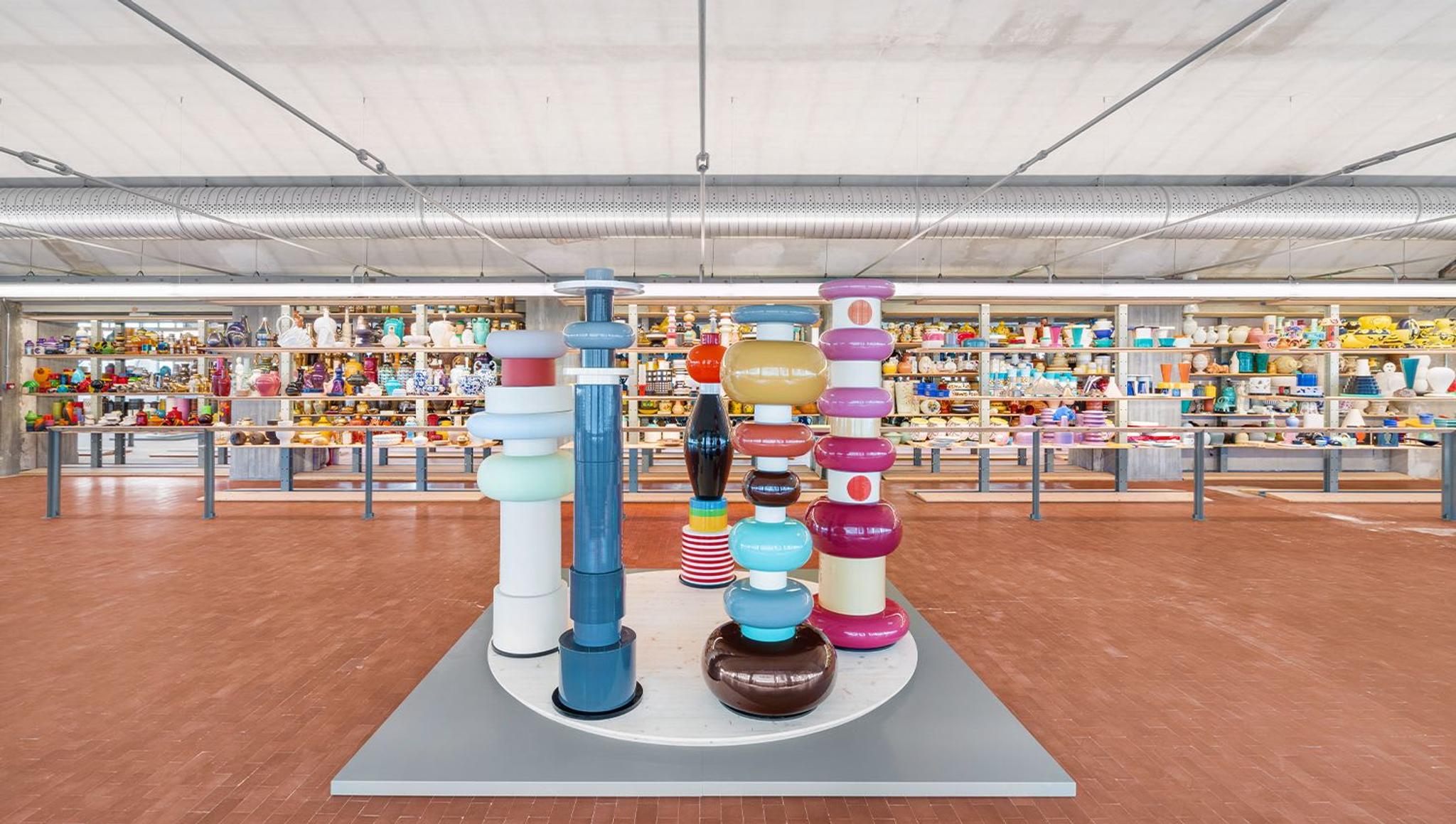 The setup is the result of museography and curatorial research, lining up a variety of colorful pieces on site-specific fir-wood shelving. Exceptional creations like Rimini by Aldo Londi, the Totems by Ettore Sottsass, or the work Il dormiente con il coccodrillo (Sleeping ones and crocodiles) by Mimmo Paladino stand out at the center of the space, standing out for their uniqueness and dimensions. The last shelf is kept empty to leave room for new creative productions and collaborations.